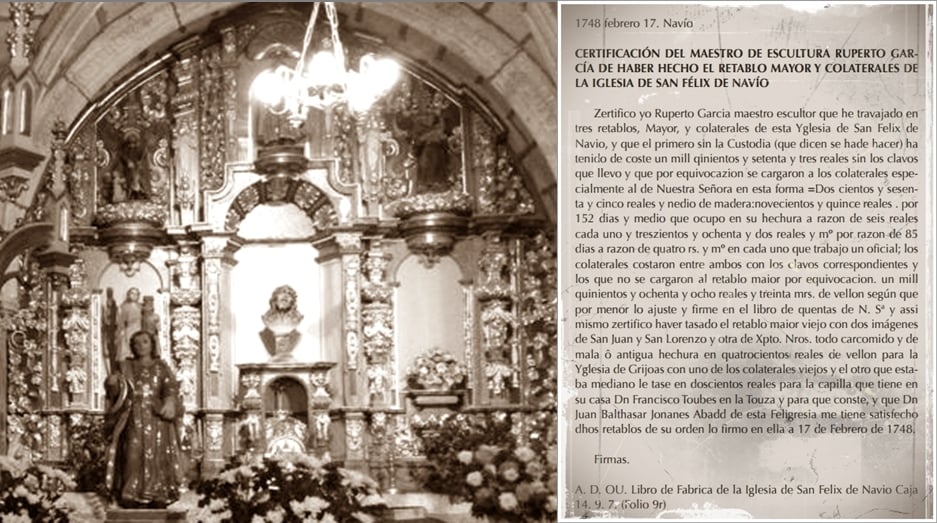 No Libro de Fábrica da Igrexa de San Fiz , libro 14.9.7 (folio 9r) o mestre de escultura Ruperto García , no ano 1748 traballou no retablo maior e colaterais da Igrexa . Ademais tamén realizou unha restauración da imaxe da Virxen do Rosario , que por certo fai moitos anos que non figura en ningunha parte da Igrexa .