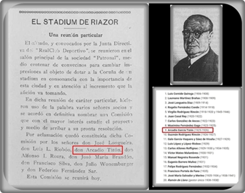 Como ben sabedes, o noso veciño de San Fiz : Arcadio García Tizón no ano 1925 foi elexido presidente do Deportivo da Coruña. A primeira entrevista que lle fixeron foi pra revista " Galicia" en Xulio dese mesmo ano.Foi o presidente que sentou as bases do que no futuro sería un club importante. Con el fixéronse as primeiras fichaxes de adestradores e de xogadores de renome doutras provincias. Tamén diu un pulo grande, con un amaño urxente o que se chamaba o " stadium ", pero coa mirada posta noutro campo máis importante pra ciudade de A Coruña.